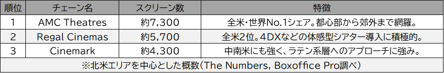 アメリカの興行界を牽引する3大チェーンの規模は、日本のそれとは桁違いです。 特にAMCは世界最大の興行会社として知られ、圧倒的なネットワークを誇ります。