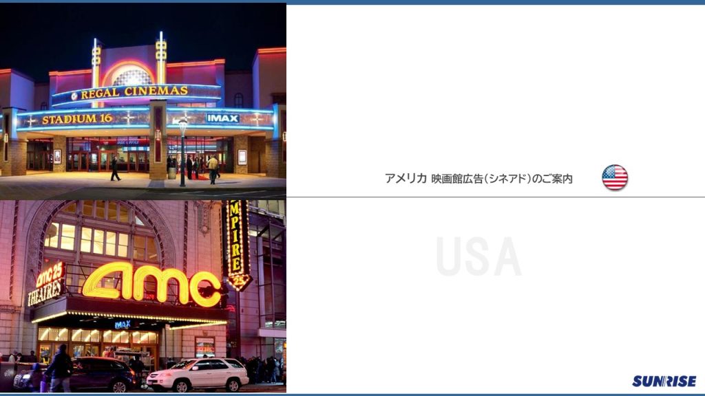 サンライズ社では現地の主要エージェンシーと提携し、アメリカ国内の映画館スクリーンへの広告出稿をスムーズに行う体制を整えております。