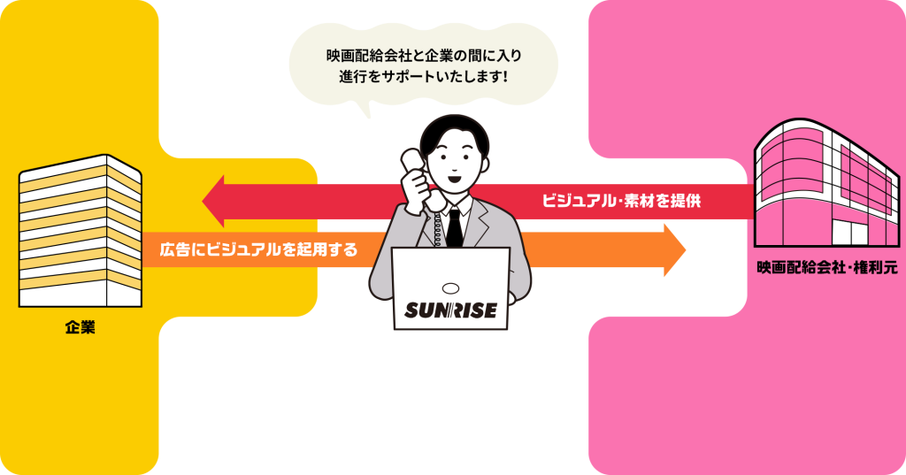 ここで私たちサンライズ社が、広告主(企業)と映画配給会社の間に入り、企画を成立させるためのコーディネーターとして、これらの複雑な権利処理と露出量の交渉・管理を行い、プロジェクトを円滑に進行いたします。