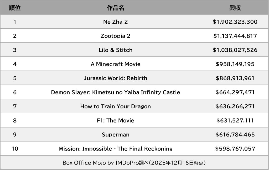 全世界の映画興行成績を集計・分析しているBox Office Mojoの発表によると、2025 Worldwide Box Officeでは以下のランキングになっています。
