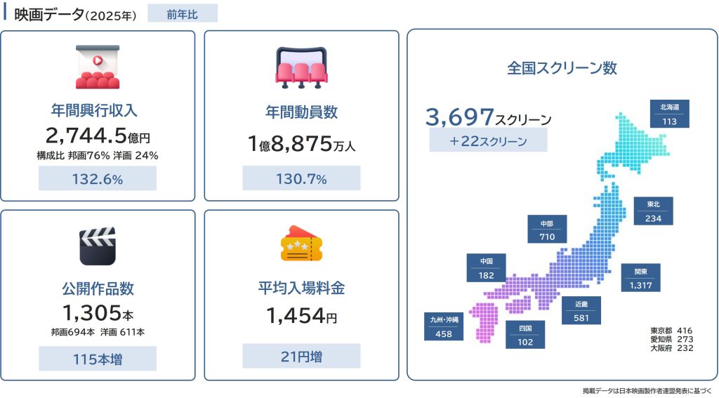 2025年の興行収入は2,744億円、総入場者数は1億8,875万人となり、前年を大きく上回る成績を記録しました。興行収入では、コロナ禍前の2019年の最高成績2,612億円を更新して歴代1位に輝きました。総入場者数も2000年以降、19年に迫る2位の好成績を収めました。